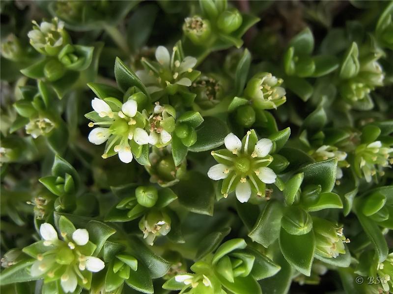 Blöðin gulgræn, þykk og safarík, egglaga eða öfugegglaga, oddbaugótt, heilrend, stilklaus, gagnstæð, 1-2,5 sm á lengd og 5-15 mm á breidd. Blómin hvít, fimmdeild, stök eða í blómfáum skúf á greinaendum, 8-15 mm í þvermál. Krónublöðin, öfughjarta- eða spaðalaga, naglmjó. Bikarblöð álíka löng eða aðeins lengri en krónublöð, græn, egglaga og odddregin. Fræflar 10, ein fræva með þrem (til fjórum) stílum. Aldin hnöttótt, allstórt grænt hýðisaldin (ber) og var plantan því stundum nefnd berjaarfi. Yfirleitt sérbýli, þ.e. annaðhvort bara kvk blóm eða bara kk blóm á einstaklingum tegundarinnar. Blómgast í júní.LÍK/LÍKAR: Engar. Auðþekktur á þykkum, kjötkenndum og safaríkum, blöðum og á heimkynnum sínum.