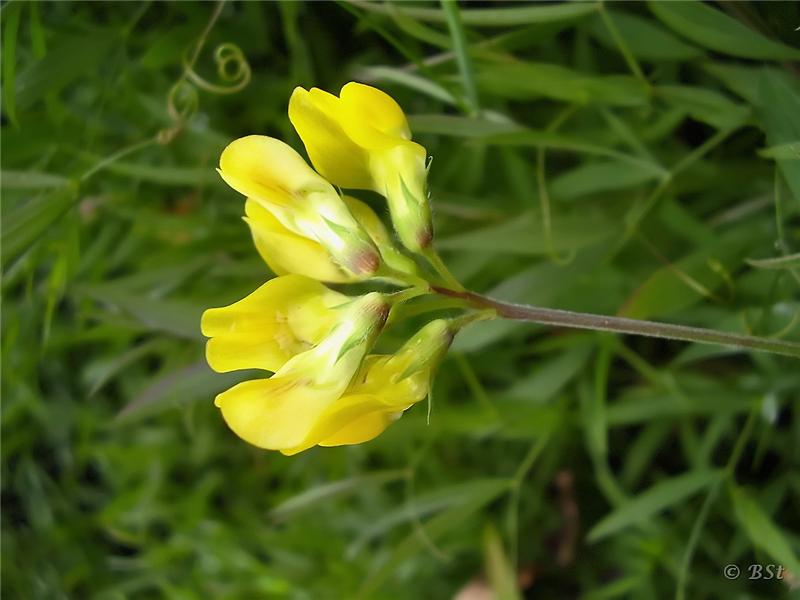 Blöðin stakstæð, fjöðruð með aðeins einu fullmynduðu blaðpari, en vafþráðum í endann sem oft vefjast utan um nærliggjandi plöntur. Smáblöðin mjólensulaga, 2-3 sm að lengd, hvassydd. Tvö skakkörlaga og hvassydd axlablöð eru oftast við blaðfótinn.Blómin ljósgul, þéttstæð, í löngum klösum úr blaðöxlum. Hvert blóm um 1,5 sm á lengd, einsamhverf, stuttstilkuð, 6-10 saman í einhliða klasa. Bikarinn um 1 sm á lengd, klofinn niður til miðs í 5 mjóa og odddregna flipa, taugarnar hærðar. Fræflar 10, ein fræva. Aldinið belgur. 2n = 14. Blómgast í júlí-ágúst. Lík/líkar: Engar, auðþekkt á gulum blómum og aðeins einu pari smáblaða.