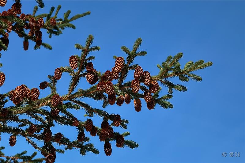 Króna gamalla trjáa breið-keilulaga. Börkur grár til rauðbrúnn með þunn heistur. Neðri greinar nær láréttar út frá stofni, þær efri skástæðar upp á við.Brum egglaga, allt að 5mm á lengd, snubbótt, ljósbrún, kvoðug. Árssprotar glansandi, ljósgráir til appelsínubrúnir, hárlausir, nálanabbar áberandi uppstæðir.