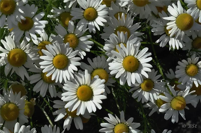 Blöðin eru tvífjaðurskipt með margskiptum smáblöðum, smábleðlar þeirra eru striklaga og örmjóir. Blómskipun karfa. Körfur stórar og fjölmargar í hálfsveip efst á stönglum, 3-5 sm í þvermál. Geislakrónur hvítar, 3-5 mm á breidd og 1,5-2 sm á lengd, útbreiddar og yfirleitt þrítenntar að framan. Hvirfilblómin eru gular pípukrónur á kúptum botni. Reifablöð aflöng, græn með dökkbrúnum eða svörtum, himnukenndum jaðri. Blómgast í júlí. LÍK/LÍKAR: Freyjubrá & hlaðkolla. Freyjubrá hefur mjög líkar blómkörfur en aðeins eina á hverjum stöngli. Þekkist einnig á því að blöðin eru fjaðursepótt eða tennt en ekki fjaðurskipt. Hlaðkollan er minni en með áþekk blöð og þekkist auðveldlega á því að hún er bara með gul hvirfilblóm en enga geisla í körfunni.