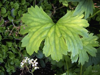 Grunnlauf kirtildúnhærð, 4-8 x 5-13 sm, kringlótt til nýrlaga, skipt til hálfs í 5-9 hvasstennta flipa sem aftur eru sepóttir og gróftennntir. Blaðstilkar allt að 10 sm langir. Stöngullauf stilkstutt. Blómin fremur lítil en fjölmörg. Blómskipun með lauflík stoðblöð. Blómbotn öfugkeilulaga, límugur. Bikarblöð 5, smá, lensulaga. Fræflar 5, jafnlangir krónublöðum. Krónublöð 5 talsins, 3-6 x 1-3 mm, öfugegglaga-spaðalaga, hvít.