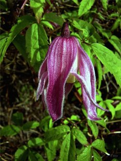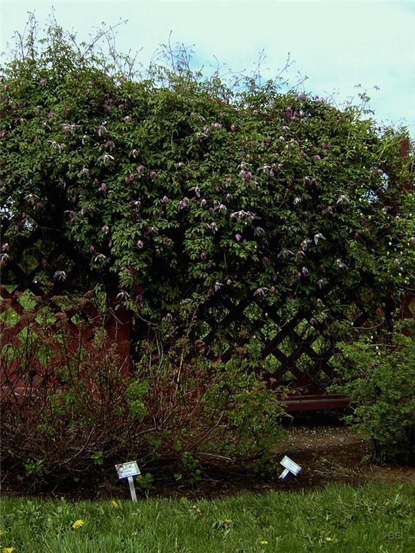 Lauffellandi klifurrunni, 2,5 m. Blómin rauðbleik, gervifræflar rjómalitir-hvítir. Því miður eru blómin aðallega falin undir laufinu.