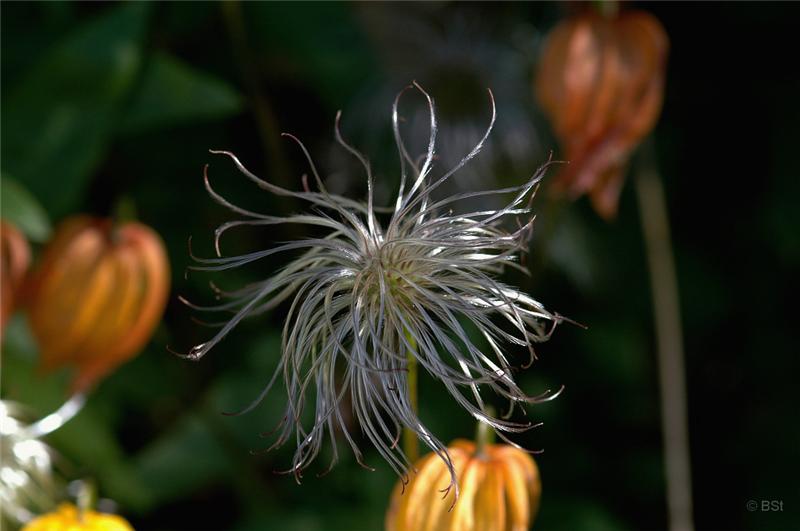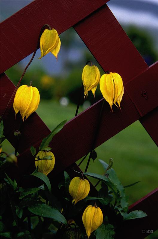 Klifurjurt allt að 3 m há. Greinar dúnhærðar, meðan þær eru ungar. Lauf fjaðurskipt eða tvífjaðurskipt, smá lauf allt að 8 sm, aflöng til lensulaga, stundum 2-3 flipa, óreglulega tennt, tennur yddar, oddar útstæðir. Skærgræn. Blóm bjöllulaga til luktarlaga, 3-4 sm, hangandi, oftast stök, blómskipunarleggur uppréttur, allt að 15 sm, dúnhærður, bikarblöð gullgul, 4, egg-lensulaga, allt að 4 sm, lang-mjólensulaga, seinna breið-skástæð, ytra borð og jaðrar silkihærðir. Smáhnetur með langa fjaðurlíka stíla.