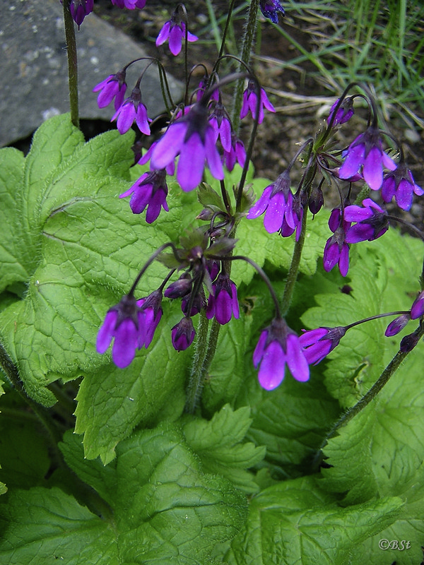 blómin í sveip, lítil, trektlaga, hangandi blöð langstilkuð, hærð, nærri kringlótt eða nýrlaga með hjartal. grunni og breiðsepótt, separnir eru ávalir og tenntir.