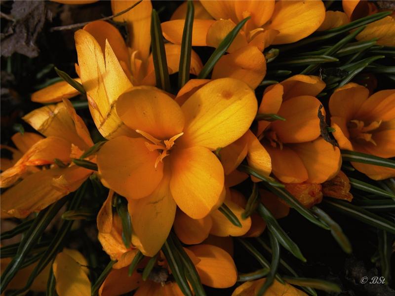 Gamalt, ófrjótt, þrílitna yrki, algengasti stórblóma, guli vorkrókusinn.