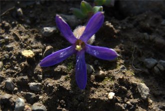 Lauf allt að 1 sm, oddbaugótt, heilrend eða með mjög grunna flipa, með hvít löng hár, Blómin stök, endastæð. Bikar með fliða til hálfs eða minna. Krónupípan trektlaga, flipar allt að 1,5 sm aflangir-odddregnir, útstæðir, himinbláir