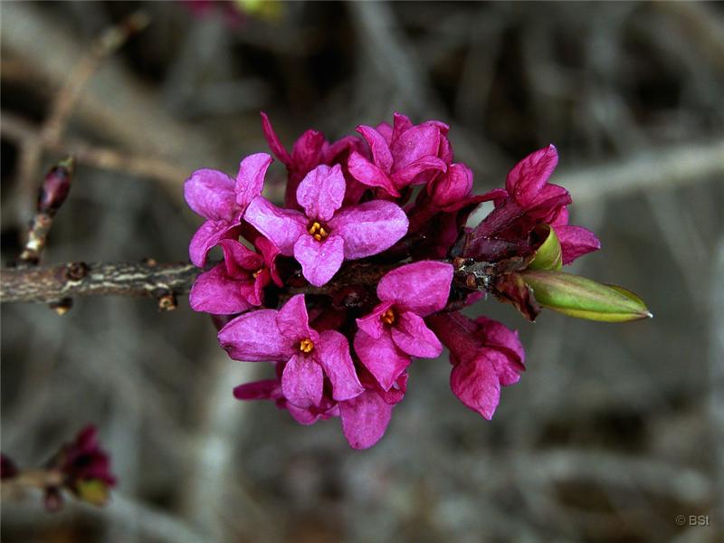 Lauf 3-8 sm, raðast í gorm á sprotanum, koma oftast að blómgun lokinni, legglaus eða með mjög stuttan legg, öfuglensulaga, endar snubbóttir eða yddir, laufin mjókka að grunni, dúnhærð og randhærð í fyrstu, verða hárlaus með aldrinum, mjúk grágræn einkum á neðra borði. Blómin legglaus, ilmandi í þéttblóma hliðaklösum, 2-4 saman á fyrra árs viði. Bikar lilla-bleikur til fjólublárauður, stöku sinnum hvítur. Pípan 5-6 mm, dúnhærð á ytra borði, flipar allt að 5 × 6 mm, egglaga, snubbóttir. Aldin skærrauð, koll-laga, á lauflausum, kjötkenndum, næstum hnöttóttum, mjög eitruðum hluta greinanna neðan við laufin. ATHUGIÐ: Allir hlutar plöntunnar eru mjög eitraðir. Ef safi plontunnar kemst í snertingu við húð getur hann valdið exemi hjá sumum.Líkar illa öll rótarröskun og það ætti að planta henni á framtíðarstaðinn eins fljótt og hægt er. Líkar heldur ekki að vera klippt og því ætti ekki að snyrta hana nema af brýnni nauðsyn.