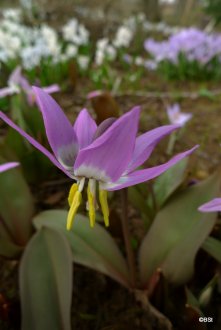 Laufin 2, oddbaugótt, með rauðleita bletti, 10-20 sm x 3-7 sm. Blómin stök, dökkbleik eða lillalit, 5-6 sm í þvermál. Blómhlífarblöð með marga smábletti, innri blómhlífarblöð með eyrnablöð. Fræflar gulir, andstætt evrópsku tegundinni hundatvítönn (E. dens-canis), sem er með dökklilla eða brúna fræfla.