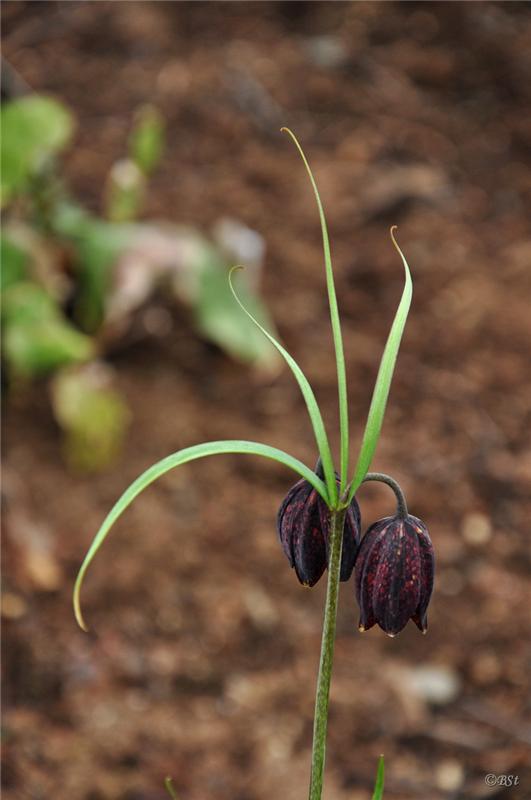 Lauf 8-20, yfirleitt gagnstæð neðst, hin eru stakstæð eða 3 í kransi, bandlaga. Blómin 1-3, breið-bjöllulaga, stoðblöðin ekki uppundin í toppnum. Blómhlífarblöð 18-26 x 8-12 mm, oddbaugótt, innri blómhlífarblöðin breiðari, alls ekki baksveigð í toppinn, græn, mikið tígulmynstruð, dökkrauð eða purpura með svörtu eða brúnu. Hunangskirtlar 10-15 mm, 5 mm ofan við grunn blómhlífarblað, bandlaga. Stíll 8-10 mm, nöbbóttur, 3-greindur, greinar 2-7 mm. Fræhýði öfugegglaga, ekki með vængi.