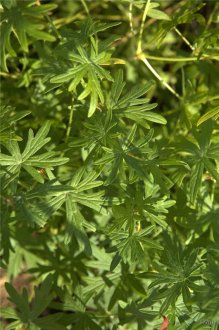 Grunnlauf fá, ekki jafn djúpskipt og stöngullaufin. Stöngullauf bogadregin að útlínum til, mjög djúpskipt í 5 til 7 mjóa flipa, lítið eitt tennt, skiptingin þríflipótt, ytri flipar útglenntir, 5-10 sm breið, sum axlablöð samvaxin. Blómskipunin útbreidd, kvíslskúfar ein-blóma, blómin oftast upprétt, 40 mm í þvermál, blómskipunarleggir 7 mm Bikarblöð 10 mm, oddur 3,5 mm. Krónublöð 21 x 17 mm, hjartalaga, oftast sýld, hvít, grunnur hvítur, æðar dýpri, frjóhnappar styttri en bikarblöðin, grunnur úttútnaður, oddar með sama lit og krónublöðin. Frjóhnappar bláir, stíll 5 mm, fræni 4,5 mm, rautt eða lifrautt. Ung aldin upprétt, leggir uppréttir, trjóna 30 mm, frævur 4,5 mm, fræjum slöngvað burt.