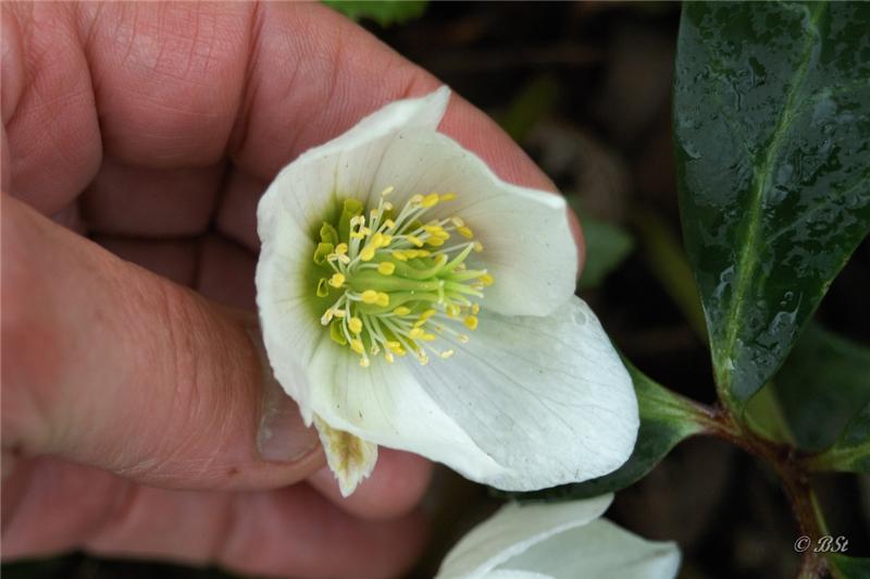 Blómin stök eða 2-3 saman, blómskipunarleggur sterklegur, styttri en eða jafnlangur og laufin, blómin hvít, með græna slikju í miðjunni, fá bleika eða purpuralita slikju með aldrinum, verða appelsínulit-purpura þegar þau sölna, allt að 8 sm í þvermál.Blómhlífarblöð mismunandi í laginu, breiðegglaga eða oddbaugótt eða næstum kringlótt. Hunangskirtlar 12-20, með legg, sveigðir-pípulaga, grænir. Fræflar allt að 2 mm, frævur 5-8, samvaxnar neðst. Fræhýði allt að 2,5 sm, fræin brún með áberandi, ljóst olíukorn.