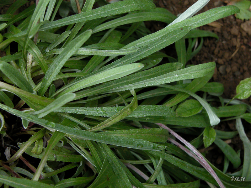 Grunnlauf spaðalaga, stöngullauf allt að 4 sm, bandlensulaga, græn ofan. Blómskipunarlauf bandlaga-aflöng, þétt hvítullhærð, stjarnan allt að 10 sm í þvermál. Körfur allt að 12 mm í þvermál, smáreifar hvassyddar, ullhærðar, jaðar og oddur himnukennd. Aldin hárlaus eða hærð.