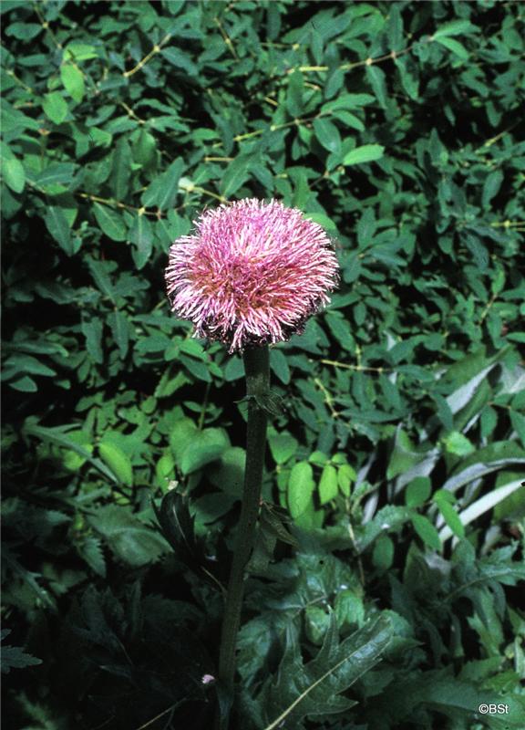 Laufin í stórum hvirfingum, laufin milligræn, allt að 60 sm löng og djúpskert með odda á jöðrunum. Stönglar sverir, sívalir, allt að 60 sm háir. Körfurnar stakar, purpuralitar, allt að 7 sm breiðar. Stönglar margir með stór, glæsileg blóm sem minna á þisla. Rætur djúpstæðar.Ekki í RHS