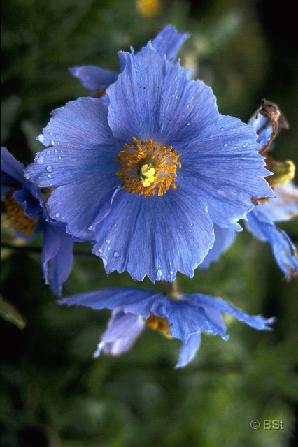 Laufin allt að 37 x 5 sm, í þéttum grunnblaðahvirfingum, með stutt, stinn hár hér og hvar, laufin næstum legglaus eða með lauflegg, öfuglensulaga til til egglaga, mjókka smám saman að grunni, hvassydd til bogadregin í oddinn, með löng, veikbyggð þornhár alls staðar, heilrend eða óreglulega sagtennt til flipótt, laufleggur allt að 20 sm, bandlaga, breiðust við grunninn. Blómin stök, blómleggir 1-5, allt að 70 sm, með aftursveigð þornhár. Krónublöð 5-8, öfugegglaga, allt að 5 x 4 sm, purpura til ljósblá, frjóþræðir purpura til ljósbláir. Frjóhnappar appelsínugulir. Aldin upprétt, mjó-aflöng til aflöng-oddvala, hárlaus til þétt þornhærð, hárin vita aftur, opnast með 4-9 lokum að einum þriðja af lengdinni.