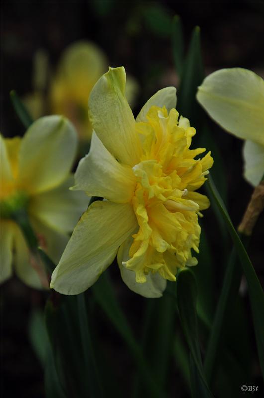 Blómin vita uppá við og eru með rjómalita blómhlíf, hjákrónan kögruð, appelsínugul með gult band.