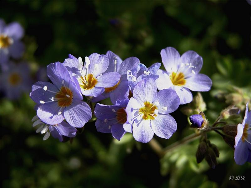 Blómskipunin þétt, bikar 4-6 mm, flipar lensulaga-aflangir, (sljó)yddir. Krónan 7-13 mm, næstum bjöllulaga, blá til fjólublá eða hvít, krónupípan gul unnan, flipar 8-25 mm.