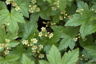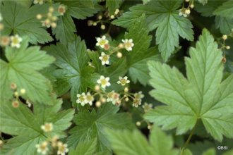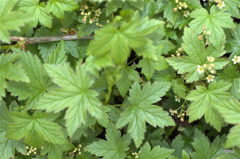 Lauf 3-8 sm, kringlótt, þunn, með 5-7 flipa, slétt ofan, dúnhærð neðan, einkum á æðastrengjunum, illa lyktandi. Blómskipunin í uppréttum klösum með 8-12 blómum, rauð-hvít, fín-dúnhærð. Ber 8 mm í þvermál, rauð, kirtilþornhærð. &