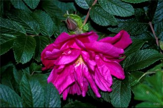 Blómin 9 sm breið, rauðfjólublá til djúp bleik með gula fræfla, einföld til hálffyllt, með 17-25 krónublöð, blómin í klösum, ilma mikið. Lotublómstrandi, stöku blóm koma fram eftir hausti eftir aðalblómgunina. Nýpur eru margar, stórar og rauðar að haustinu. Dæmigert ígulrósarlauf.