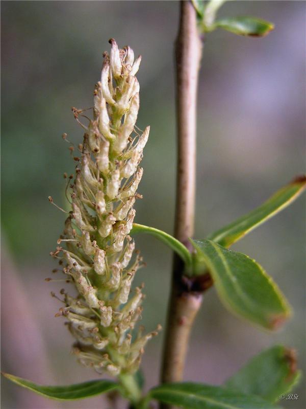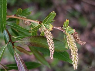Lauf 5-10 sm löng, lensulaga-egglaga, hárlaus, glansandi dökkgræn á efra borði, matt ljósgræn, sagtennt. Laufleggur með kirtla efst. Axlablöð stór, langæ. Reklar koma um leið og laufin, karlreklar eru 3-7 sm langir, fræflar 3, kvenreklar styttri og þéttari, 1 hunangskirtill.