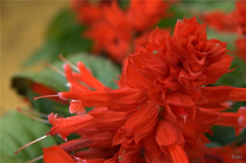 Laufin 7 x 5 sm, með legg, óskipt, egglaga, mjókkar smám saman fram í mjóan odd, grunnur snubbóttur eða hjartalaga til fleyglaga, jaðar skörðóttur, kirtil-pikkaður neðan, hárlaus til smádúnhærður, laufleggur allt að 3 sm. Blómin í 3-6 blóma krönsum, í endastæðum axkenndum klasa allt að 20 sm, blómleggir allt að 4 mm, dúnhærð. Stoðblöð allt að 12 x 5 mm, skammæ, egglaga til lensulaga, mjó-hvassydd, skarlatsrauð. Bikar allt að 22 mm, pípulaga til bjöllulaga, 8-tauga, himnukennd, hárlaus eða dúnhærð, skarlatsrauð, tennur egglaga, hvassyddar. Krónan skarlatsrauð, pípan allt að 35 mm, trektlaga, víkka út efst, hárlaus, efri vörin 13 mm, tvíklofin, neðri vörin styttri, smá dúnhærð.