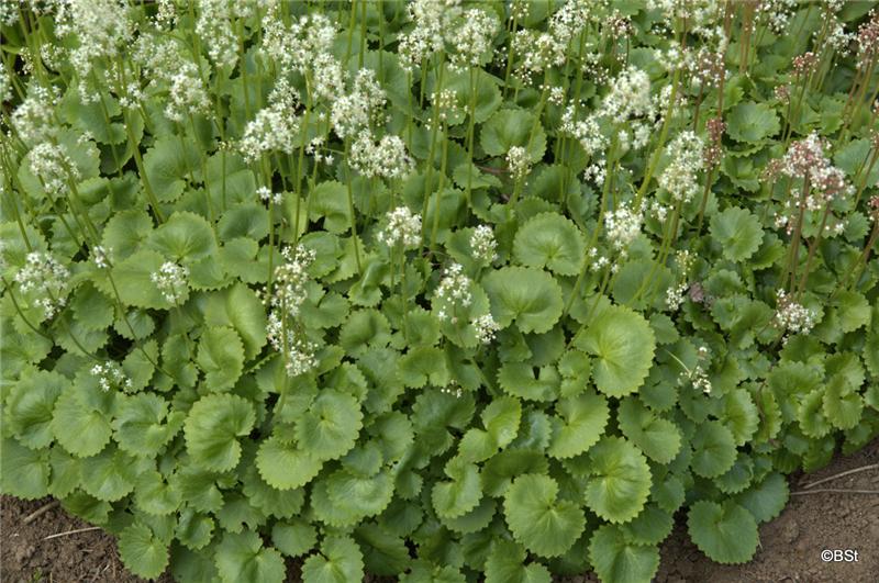Blómleggur 22-33 sm hár. Laufleggur 4-10,7 sm, kirtil-langhærður, blaðkan nýrlaga, 1,6-5,5 x 1,9-6,5 sm, kirtildúnhærð á efra borði, handstrengjótt, jaðar með 19-21 tönn, kirtilrandhærður, tennur breið-egglaga. Blómskipunin skúfur, 5-15 sm, með 30-52 blóm, greinar og blómleggir kirtilhærð. Blómbotn um 0,6 mm, hárlaus. Bikarblöð aftursveigð, egglaga til breið-egglaga, 0,7-1,3 x 0,7-1 mm, hárlaus. Krónublöð hvít eða lillalit, egglaga, 2,1-2,7 x 1,6-1,8 mm, eintauga, grunnur samandreginn í nögl 0,5-0,7 mm, krónublöðin oddnumin. Fræflar 2-3 mm, frjóþræðir kylfulaga. Frævan hálfyfirsætin til yfirsætin, samvaxin aðeins við grunninn, purpuralit eða græn, keilulaga með hunangskraga við grunninn. Stílar uppréttir eða ögn útstæðir, 0,2-0,5 sm, fræhýði upprétt eða ögn útstæð, flöskulaga, 5-6 mm.
