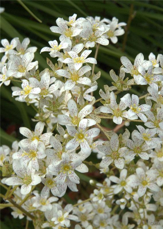Lauf 3-8 x 2-3 mm, öfugegglaga til öfuglensulaga eða spaðalaga, snubbótt og dálítið niðursveigð, heilrend, nema með fáein kanthár við grunninn, engin glær rönd, greinilega bláleit, nokkrirkalkkirtlar á jöðrum og líka á víð og dreif á efra borði blaða. Blómstönglar 3-11 sm, greinast ofan við miðju í 6-12 blóma skúf. Krónublöð 4-5 mm, öfugegglaga, hvít, doppulaus.