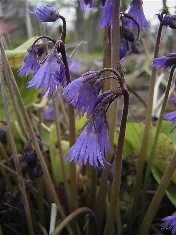 Blöðin þykk, skinnkennd, sígræn, nýrlaga eða nærri kringlótt og heilrend, skærgræn á efra borði en oftast fjólublá á neðra borði, 2-7 sm í þvermál, grunnskerðing djúp eða engin. Blómstönglar eru 5-30 sm með trektlaga, drúpandi blóm, 1-1,8 sm í þvermál, 6-8 saman í hverjum sveip, hvert blóm kögrað 18 striklaga flipum. Blóm blá-lilla.