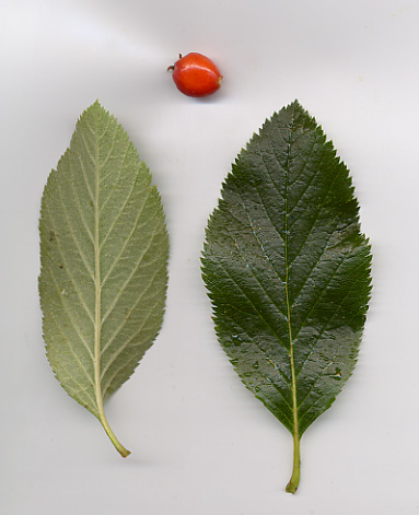 Laufin eru lengri en 10 sm, mjó-aflöng, hvass tvísagtennt, með grunna flipa, græn ofan en grá neðan. Blómin í 6-8 sm hálfsveipum, bleik, minna á gljáreyni (S chamaemespilus). Aldin egglaga, rauð-appelsínugul að haustinu.